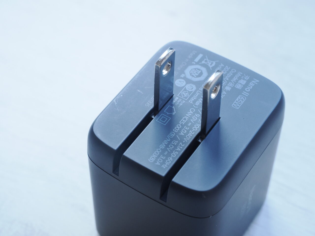 手持ちの一般的な充電アダプタ(12W出力)と比較したとき、持った時の重さが気になりました。高出力な分、一般的なUSBアダプタよりは重さがあります。