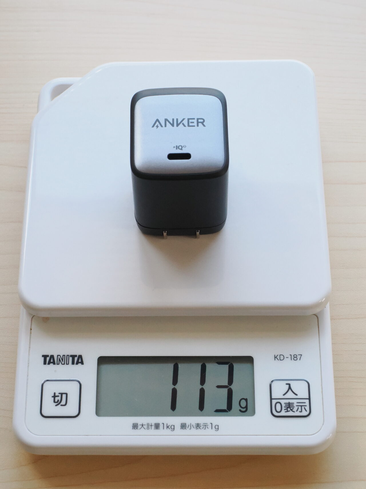 一般的なアダプタの重さは35g、Anker Anker Nano II 65Wは112gでした。